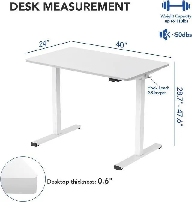 Safe & Solid: Holds up to 110 lbs with a broad height range of 28.7 - 47.6 for users of all heights(Thickness of table top is 0.6 " ). Also features anti-collision technology that prevents the desktop from damaging or crushing objects when in motion.