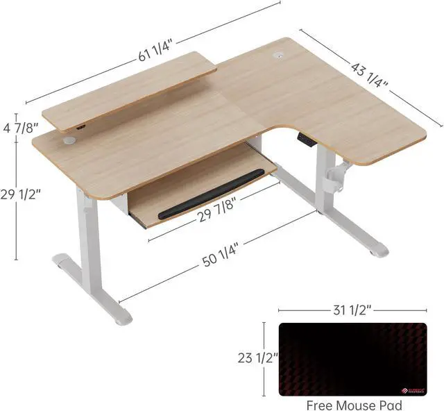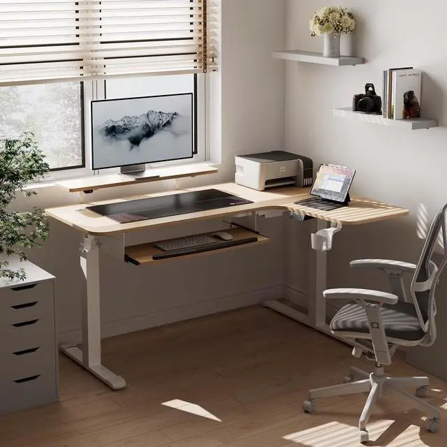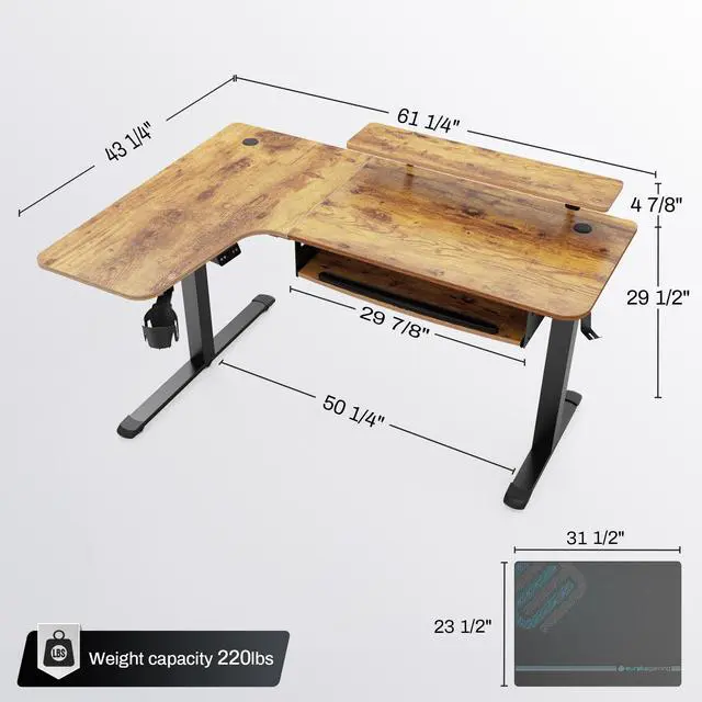 Large L Shaped DesktopThe l shaped standing desk has a Spacious 61 wide surface plus 20" extension and offers a roomy setup for 3 or more monitors and other desk accessories; with 2 strong metal legs, L60 standing desk supports up to 220 lbs