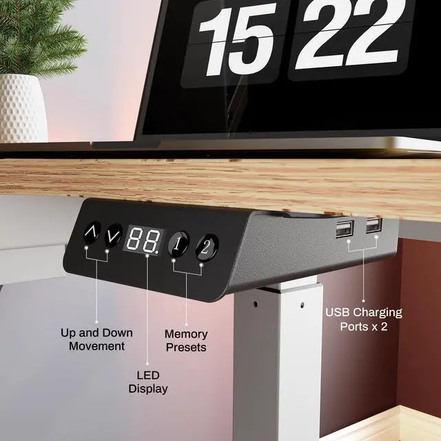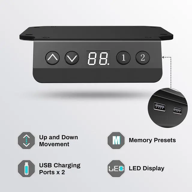Electric Standing DeskFeaturing 2 memory presets to save sitting or standing heights for children or adults, 2 built-in USB charging port is conveniently integrated into the control panel; EUREKA L60 stand-up desk can be adjusted from 29 to 48