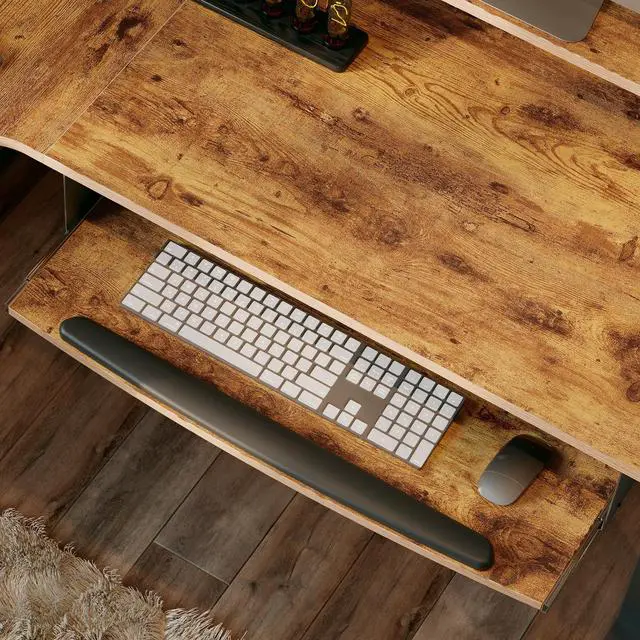 Desk with Keyboard Tray & Extra Monitor StandThe slide-out keyboard tray under the desk of 29.8" surface is a good partner and offers plenty of extra space for EUREKA height adjustable desk; RGB Monitor Stand comes with corner standing desk provides extra comfort for your neck and shoulders while working by raising your monitors up