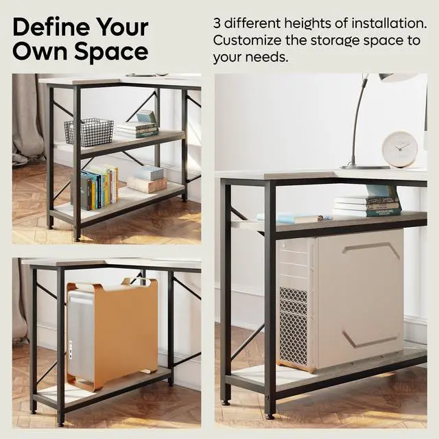 Adjustable Shelves for Multiple Use - The height of Storage Shelve under the desk can be customized to where you wanted, extra screw holes are pre-punched in advance, you can even remove it for your computer tower.