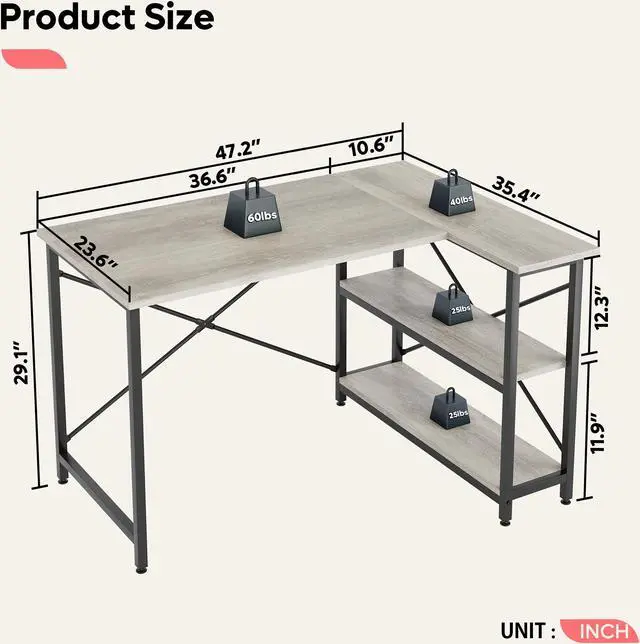 • Spacious Storage Space - The 47.2"x23.6" writing surface is a decent size to accommodate monitor, laptop, keyboard and desk accessories while still being able to have extra items nearby on the 2 shelves
