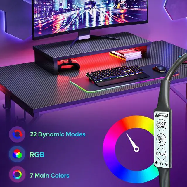 Monitor Stand with LED LightsThis gaming desk has a monitor shelf that holds up to 15 lbs, with an LED light strip that has 7 main colors, up to 22 dynamic modes providing more ergonomic and relaxed gaming experience.