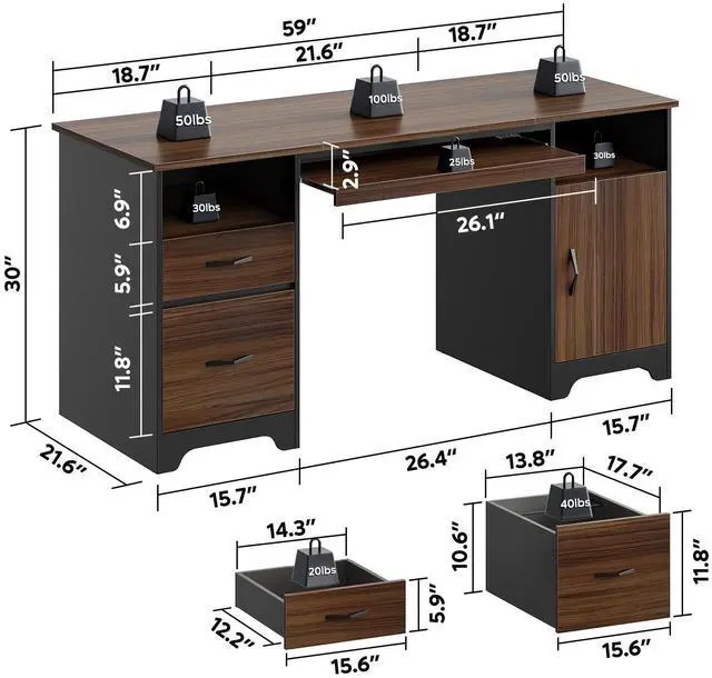 Bestier 59 Computer Desk transform your workspace with our versatile office desk, designed to meet all your professional needs. Featuring a spacious 59desktop, this desk offers ample room for your computer, books, and decor, allowing you to create a personalized and stylish environment. The smart storage solutions include 2 drawers, 1 large storage cabinet and 2 open compartments, perfect for organizing office supplies and personal items, while the built-in file drawers accommodate letter and legal-size folders, ensuring a clutter-free workspace. Our desk also boasts a flexible keyboard tray, keeping your desktop clear and organized, and enhancing your focus and productivity.