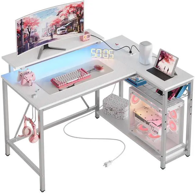 Bestier 42 L Shaped Computer Desk with LED, Corner Gaming Desk with Power Outlet,Reversible Storage Shelves and Hooks, White