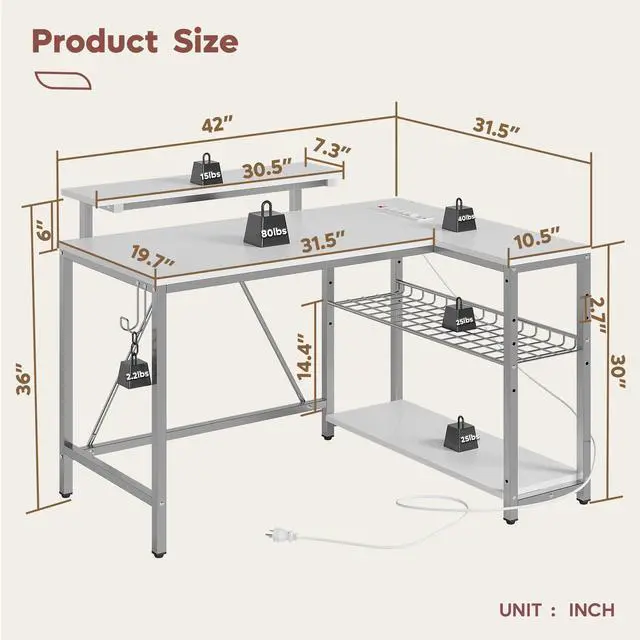Bestier 42 L Shaped Computer Desk is designed specifically for gamers to meet their various needs. Firstly, it is equipped with two power sockets, a USB port, and a TypeC port, allowing you to easily connect various gaming devices and provide sufficient power support for your gaming equipment. At the same time, there are two practical shelves under the desk, with the lower shelf being spacious and stable, making it an ideal place to place consoles and other devices. The middle grid shelf is also ingenious, not only can the tilt direction be adjusted, but it can also be adjusted according to your usage habits, making it convenient for you to store various gaming accessories.