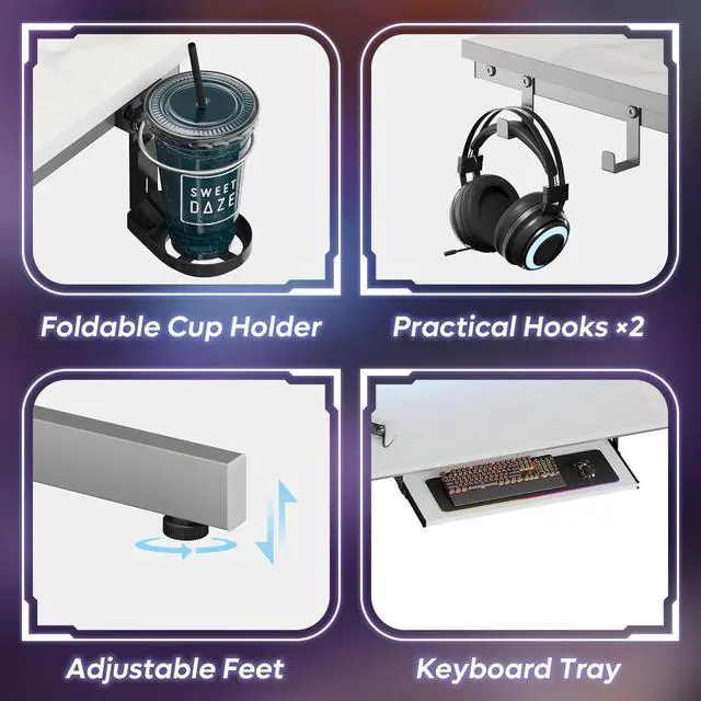 The Bestier 63" Gaming Desk provides a spacious 63 x 20-inch surface, theres plenty of room for all your gaming equipment. This gaming desk includes an ergonomic monitor stand, a cup holder, and a headphone hook for optimal organization. The gaming desk with led lights, remote control via APP, The coolness of RGB LED lights will add more attractive elements. Enhance your gaming performance with this all-in-one, feature-packed gaming desk. The pull-out keyboard tray providing a designated space for comfortable typing. This desk with 4 ac outlets, 2 USB ports and 1 Power Switch, the desk allows you to easily charge and power your devices.
