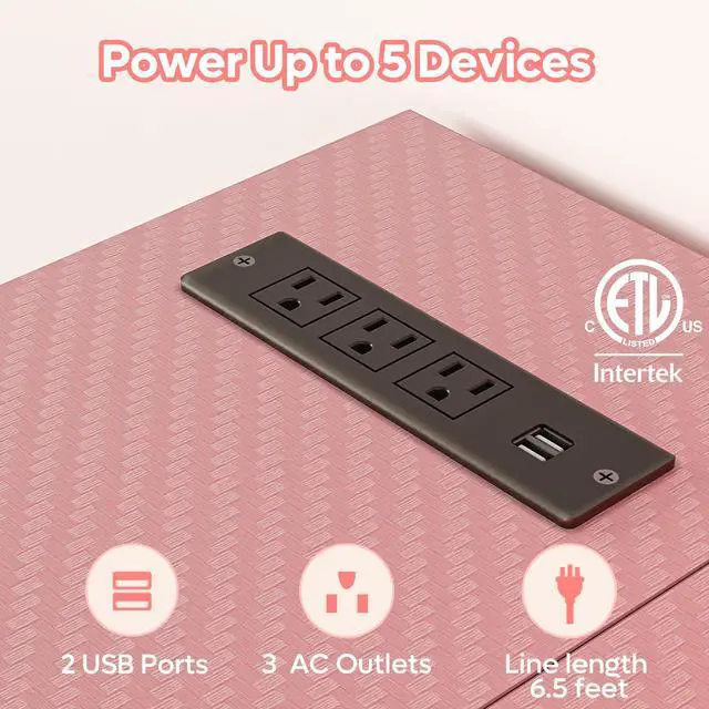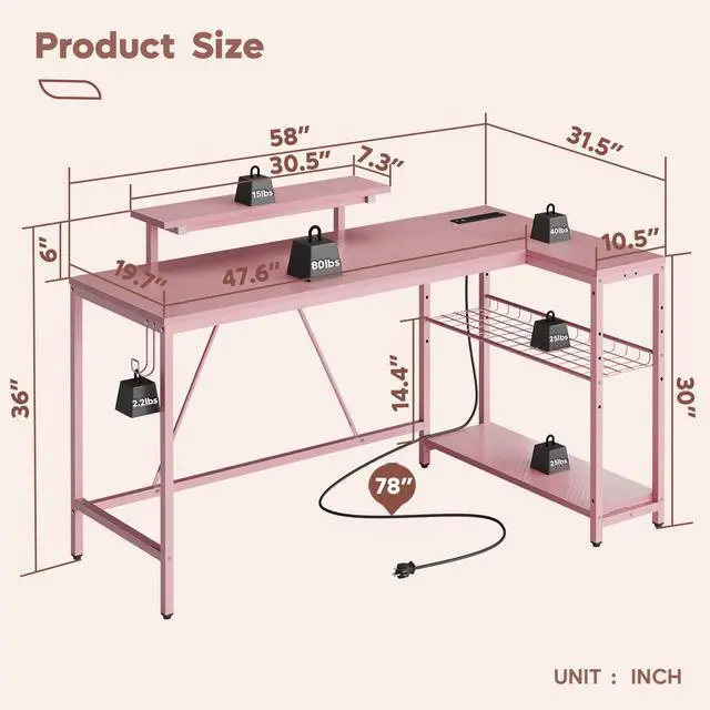 Bestier 58 L Shaped Computer Desk with led lights, remote control via APP, The coolness of RGB LED lights will add more attractive elements. And the desk with 3 ac outlets, 2 USB ports, the desk allows you to easily charge and power your devices. The left metal mesh panel has three adjustable heights and can be tilted, providing a comfortable experience. Metal hooks allow you to hang your headphones or bags, saving you desktop space. The gaming desk features a ergonomic monitor stand that can hold at computer monitors, providing an immersive multi-screen experience.