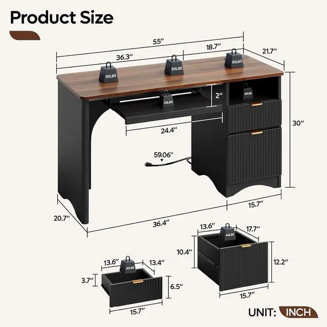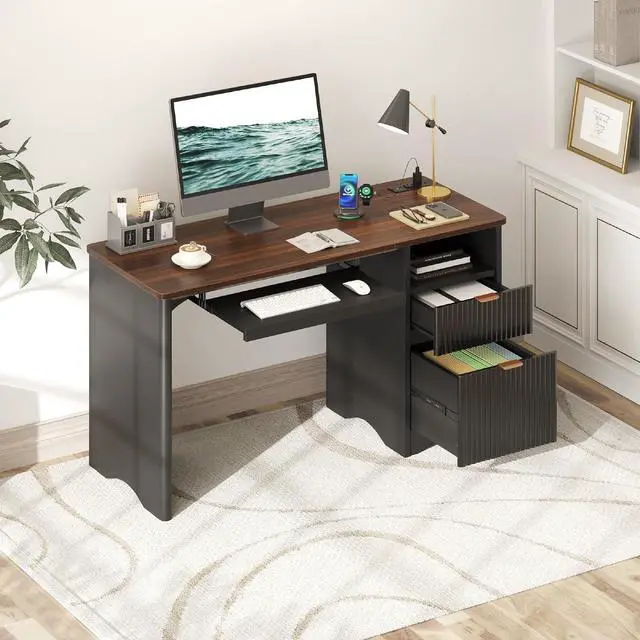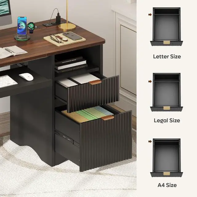Designed for organization, the desk includes a spacious open compartment with a built-in cable management hole, allowing you to keep wires from your computer, monitor, and accessories neatly hidden and untangled. The bottom file drawer comes with an adjustable hanging bar to accommodate Letter, Legal, or A4-sized files, providing a flexible storage solution for documents and supplies.
