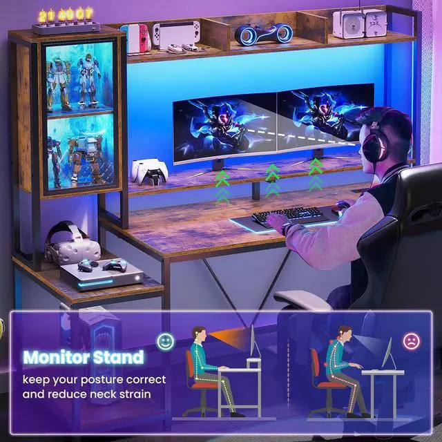 SEDETA Gaming Desk, 60'' Gaming Desk with Hutch and LED Lights, Computer Desk with Storage Shelves, Large PC Gamer Desk with Display Cabinet, Monitor Stand, Power Outlet for Home Office