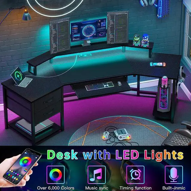 79" Gaming Desk, Computer Desk with 2 Fabric Drawers & LED Light, L Shaped Gaming Desk with Storage Shelf for Home Office, Carbon Fiber w/Free Mouse Pad - Black