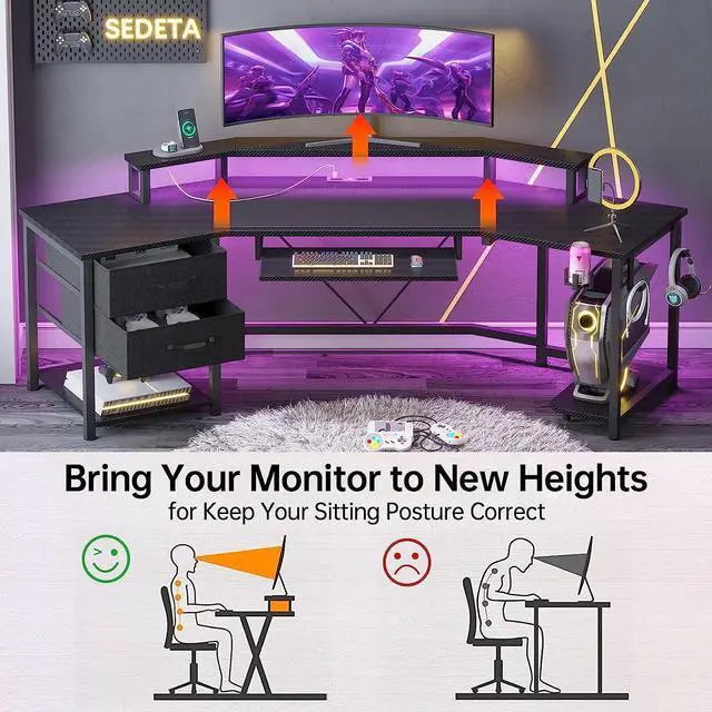 The specially cut Wing-shaped desktop of computer desk is more wrapping than the L-shaped desk.2 fabric drawers help you quickly and efficiently classify storage, which reduce the clutter on the desktop. The monitor shelf of desk fits 2-3 monitors, which is more suitable for split-screen operation.Also it can effectively reduce neck pain, designed for the people who sit for a long time.LED strips that control color and changing rhythm with APP can be installed in any position. Gaming desk has a high-quality carbon fiber cover finish, special skin-friendly touch. If you need to clean the desktop, it is recommended to use a wet towel to wipe.Buy a gaming desk and give each customer an oversized free mouse pad.The keyboard tray of desk is ideal for 108-key or 87-key keyboard + mouse, which can free up more desktop space.2 headphone hooks on the right side of the computer desk. The cup holder lets you keep a drink nearby without worrying about spilling.Metal frames can hold up to 352lbs.