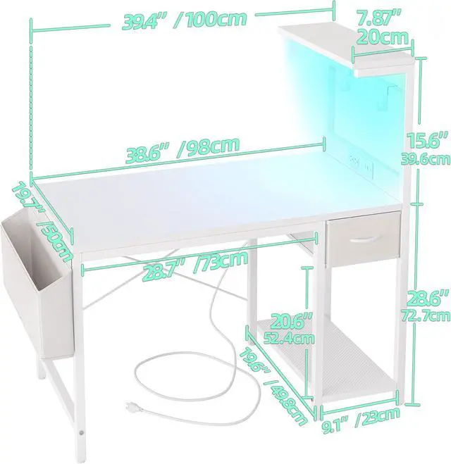 TIQLAB Gaming Desk 40 inch with Power Outlet and LED Light, Computer Desk with Reversible Shelves and Storage Drawer, Small PC Desk for Home Office Table with Bag, Carbon Fiber White