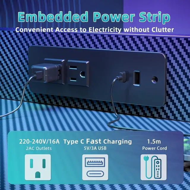 2. Fast Charging Power Outlet: This power outlet features two sockets, one USB port, and one Type-C fast charging port. It allows you to conveniently charge your phone, tablet, and other electronic devices while keeping your desktop neat and organized.