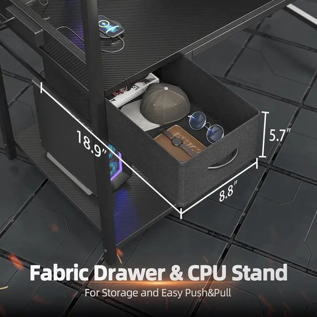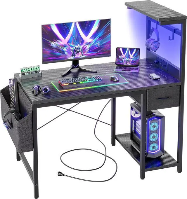 TIQLAB Gaming Desk 40 inch with Power Outlet and LED Light, Computer Desk with Reversible Shelves and Storage Drawer, Small PC Desk for Home Office Table with Bag, Carbon Fiber Black