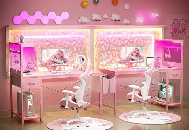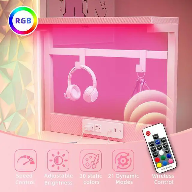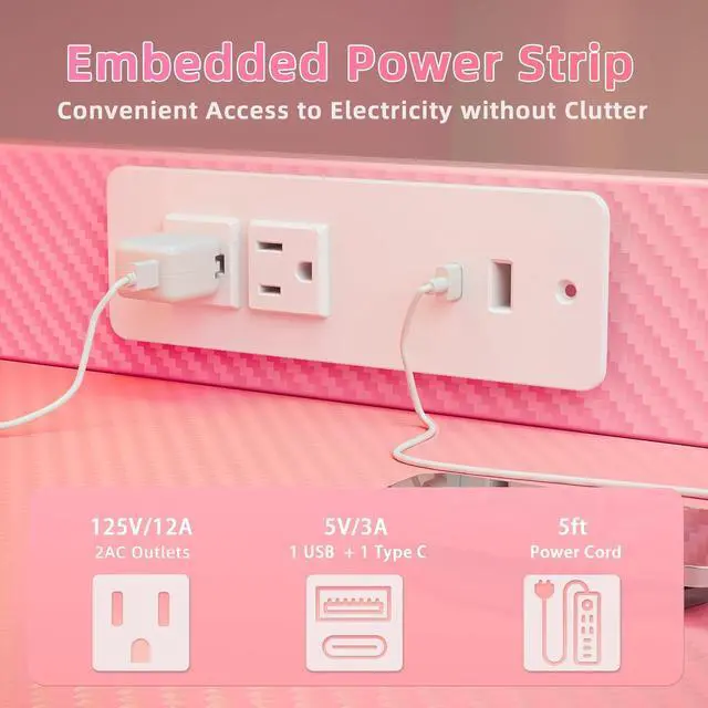 TIQLAB Gaming Desk 55 inch with Power Outlet and LED Light, Computer Desk with Reversible Shelves and Storage Drawer, Small PC Desk for Home Office Table with Bag, Carbon Fiber Pink