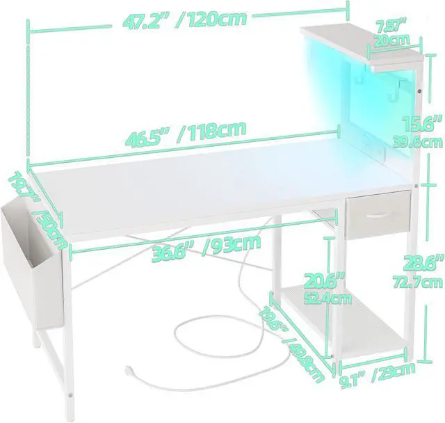 TIQLAB Gaming Desk 47 inch with Power Outlet and LED Light, Computer Desk with Reversible Shelves and Storage Drawer, Small PC Desk for Home Office Table with Bag, Carbon Fiber White