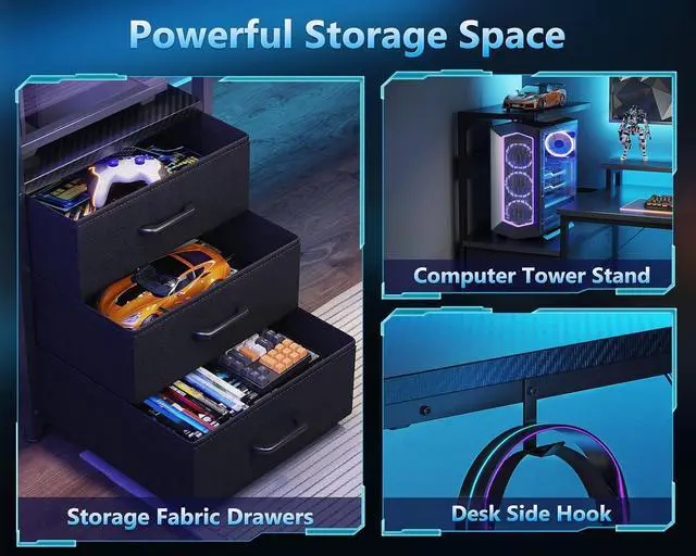 TRI-DRAWER CLUTTER CONTROL: Displaying a PC on the desk usually sacrifices workspace. We solved this with 3 spacious built-in FABRIC drawers that swallow up cables, controllers, and accessories. This ensures your desktop remains a minimalist, clean canvas, allowing your "Panoramic View" PC and monitor setup to shine without visual distractions.
