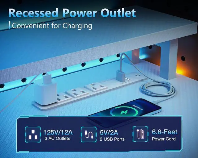 USB CHARGING PORTS & POWER & OUTLETS: The gaming desk is equipped with 3 power outlets and 2 USB charging ports for your electronic devices, you can easily charge up to 5 electronic devices such as smartphones, gaming gear, and Bluetooth devices while working, studying, or playing games. Let this computer desk add more convenience to your life!