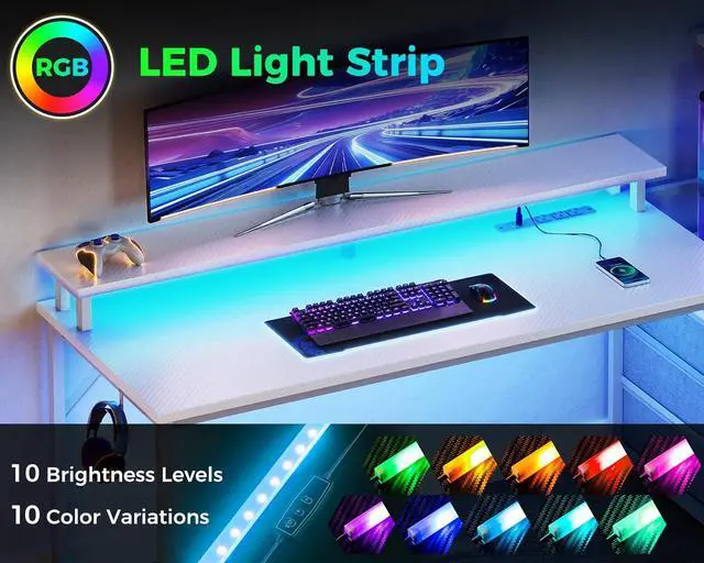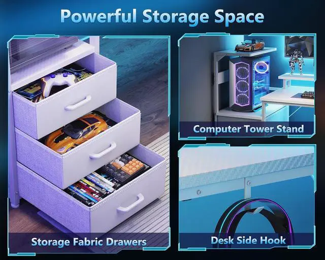 AODK 52 Inch Gaming Desk with USB Charging Ports & LED Light- Reversible Computer Desk with Storage Shelves & Monitor Stand, Modern Gamer Desk Table with Fabric Drawers & Side Hook, Carbon Fiber White