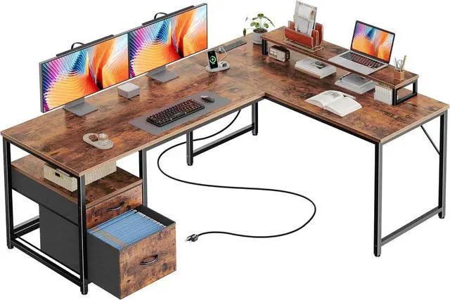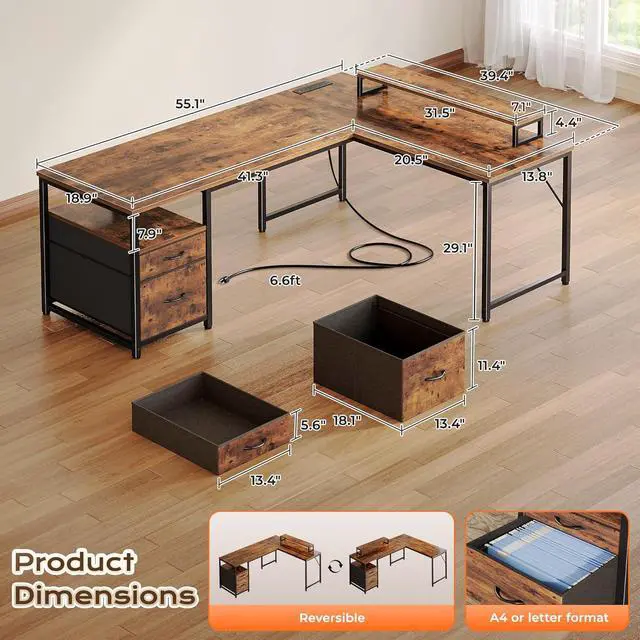 PRAISUN 55 Inch L Shaped Desk with Power Outlets and USB-C Port, Computer Corner Home Office Desk with File Fabric Drawers and Movable Monitor Stand, Larger Storage for Gaming, Study, Rustic Brown