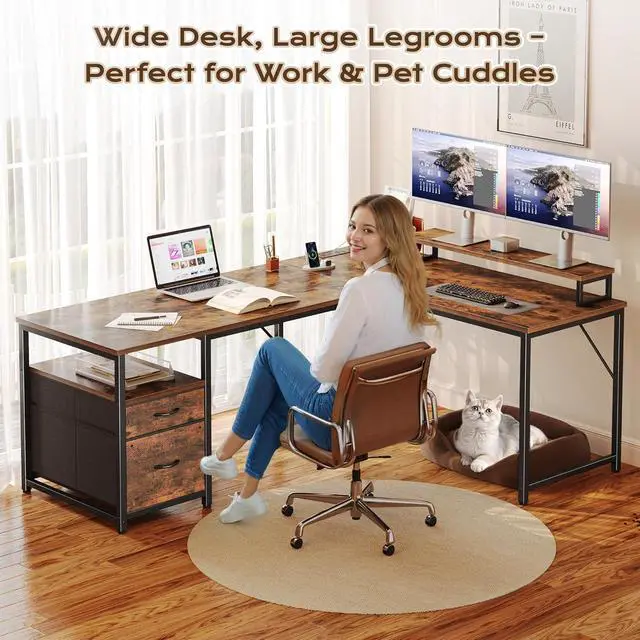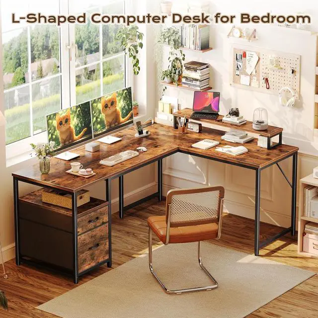 Reversible L Desk with Movable Monitor StandThe 18.9-inch deep main desk and side table form a spacious L-shape, giving you spacious zones for work, study, or gaming. The elevated monitor shelf can be set up on the main or side desktop and helps store more and reduce neck strain by raising your screen to eye level, ideal for long hours of Zoom calls or editing work