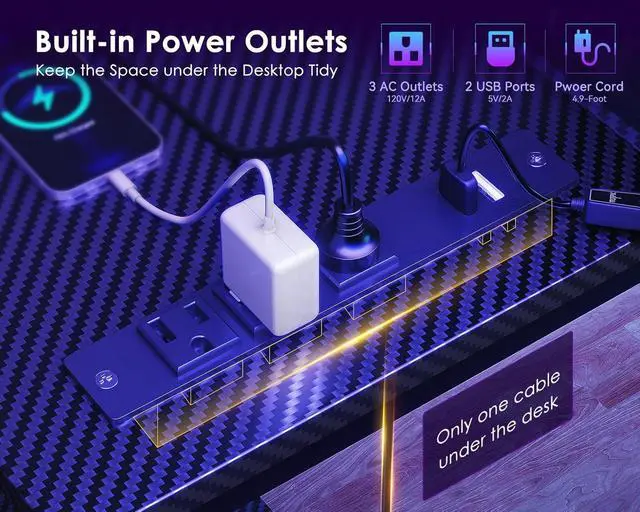 USB Charging Ports & Power OutletsThe office desk is equipped with 3 power outlets and 2 USB charging ports for your electronic devices, you can easily and conveniently charge your smart phone, gaming gear or Bluetooth devices when play computer games or work from home. A versatile hook provides additional storage space for your convenience.