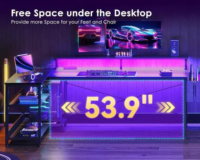 Gaming Desk with Colorful LED LightsThis gaming table features LED strip that contains 10 static colors, 6 brightness grades, 10 dynamic modes and memory function with switching controls. Adjusting to the proper lighting can reduce eye strain, improve focus, and create a comfortable workspace/gaming space.