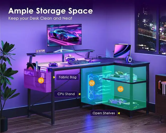 ODK 40 Inch Gaming Desk with USB Power Outlets and LED Lights, Reversible L Shaped Computer Desk with Storage Shelves & Monitor Stand, Corner Home Office Desk Table, Carbon Fiber Surface, Black