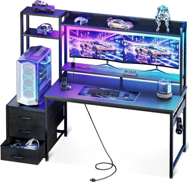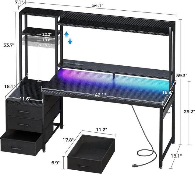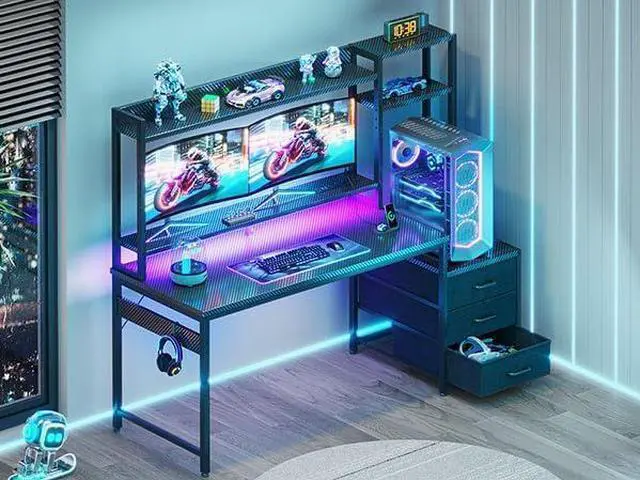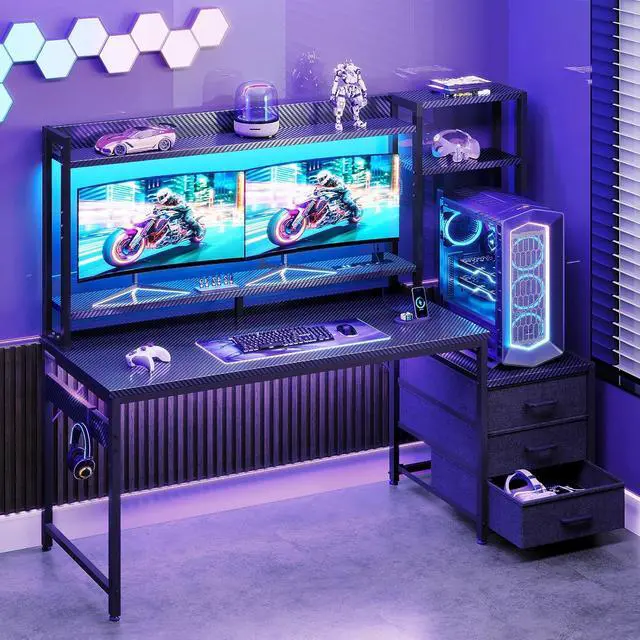 Casaottima 55 Inch Gaming Desk with Hutch & 3 Fabric Drawers, Computer Desk with USB Ports & LED Lights, Reversible Pc Gamer Table with Monitor Stand for Home Office, Carbon Fiber Black