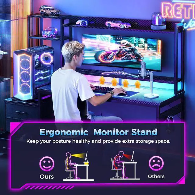 This desk features 3 fabric drawers and a hutch for ample storage, keeping your space clutter-free. The included monitor stand elevates your screen to eye level, ensuring ergonomic comfort during long gaming or study sessions.