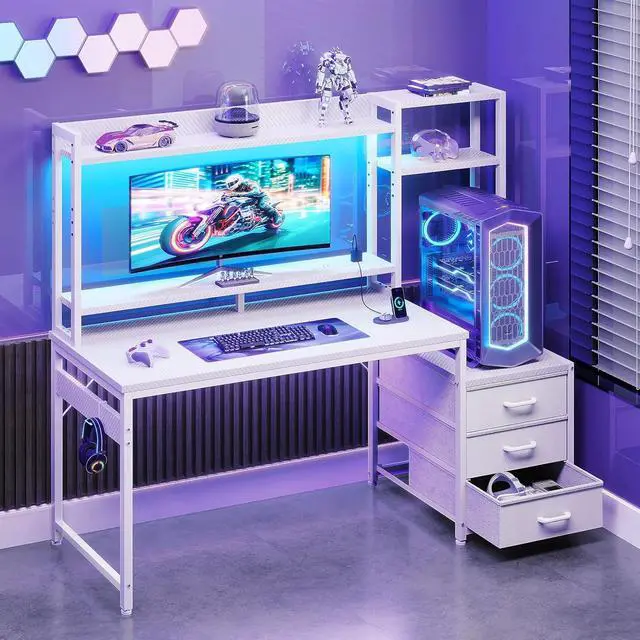 Casaottima 48 Inch Gaming Desk with Hutch & 3 Fabric Drawers, Computer Desk with USB Ports & LED Lights, Reversible Pc Gamer Table with Monitor Stand for Home Office, White