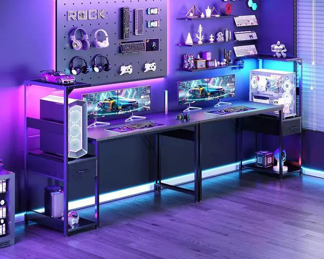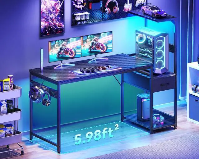 Casaottima 54 Inch Gaming Desk with Storage & LED Lights, Reversible Computer Desk with Display Shelves & Fabric Drawer, Modern Gamer Desk Table with Side Headphone Hook, Carbon Fiber Black
