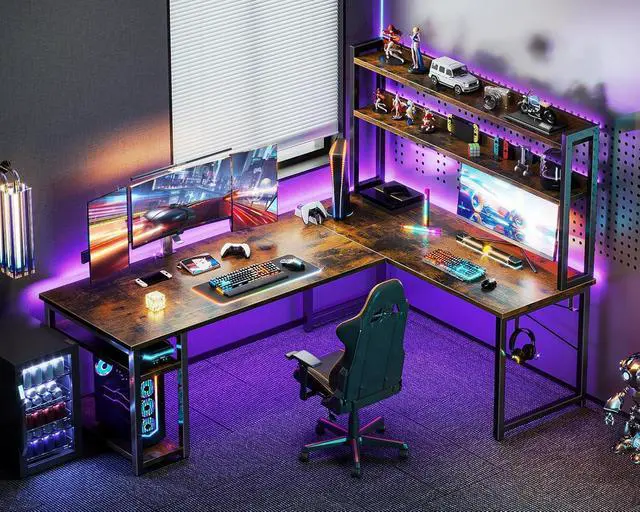 ODK L Shaped Gaming Desk with Hutch, Computer Desk with Storage Shelves, 66" L Shaped Desk for Home Office, Corner Desk with Headphone Hook, Vintage