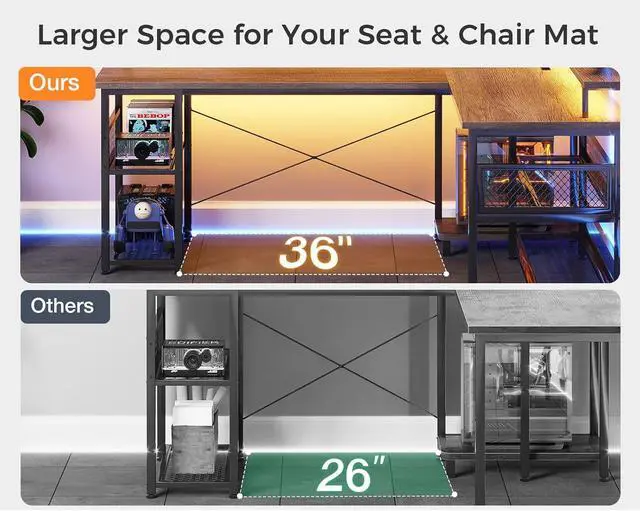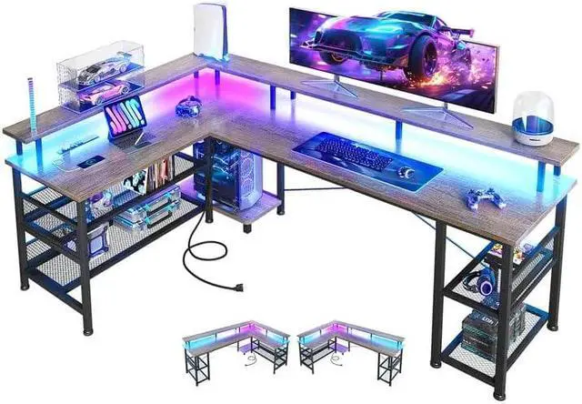 Gaming Desk with LED Lights:This l shaped desk with shelves features built-in LED lighting in 10 colors, 10 lightning modes to create an immersive gaming atmosphere. It has memory function to keep the LED lights staying on last mode when turned on.