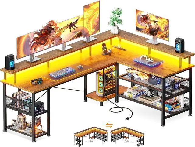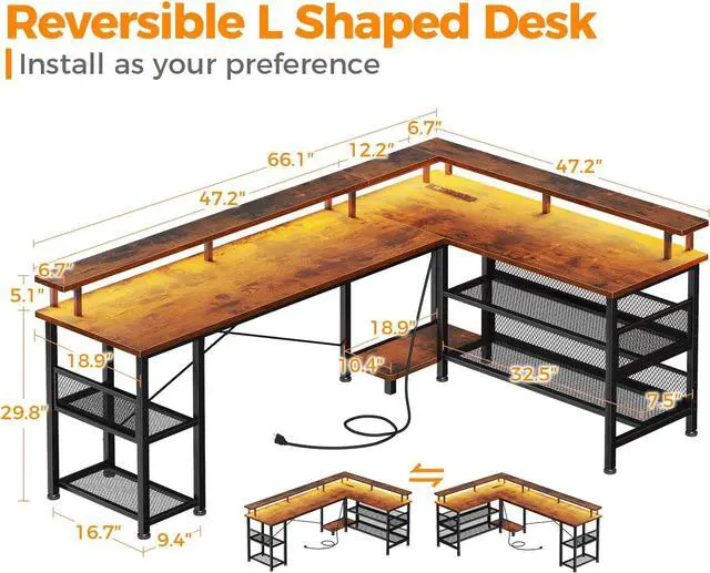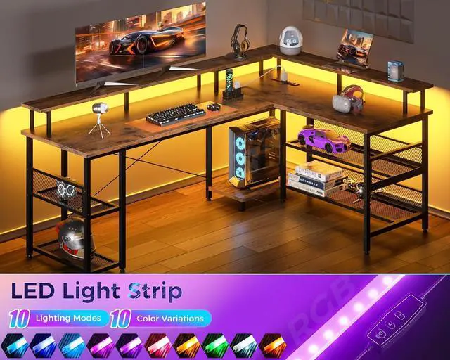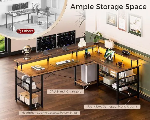 Gaming Desk with LED Lights:This l shaped desk with shelves features built-in LED lighting in 10 colors, 10 lightning modes to create an immersive gaming atmosphere. It has memory function to keep the LED lights staying on last mode when turned on.