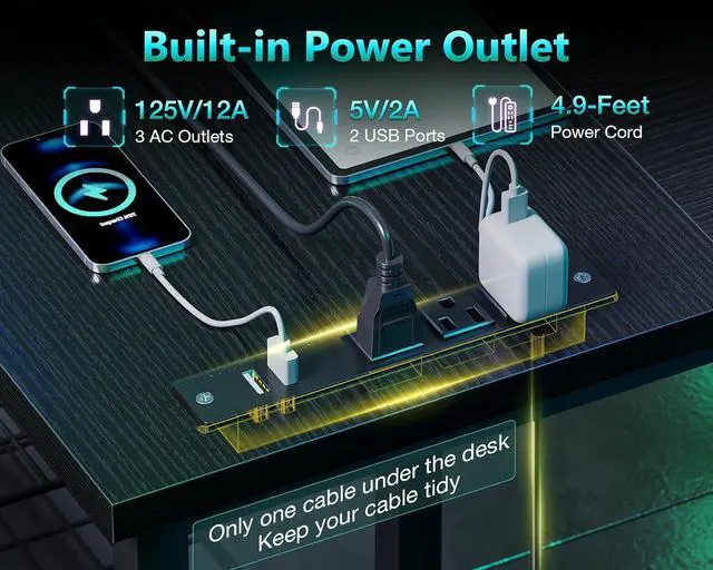 Built-in Power OutletsThis gaming desk features 1 built-in power hubs with 3 AC outlets + 2 USB portseffortlessly charge all your devices while keeping cables tidy and within reach.