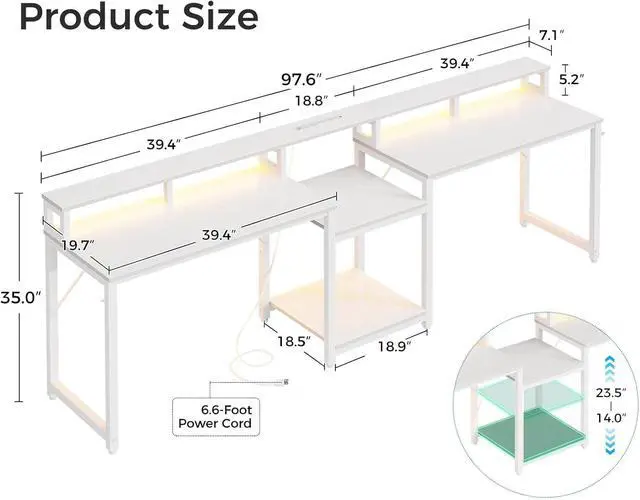 Large Workspace & Powerful Storage FunctionThe 97.6"(L) x 19.7"(D) desktop is big enough to accommodate your monitor, keyboard and other items without sacrificing your workspace and desktop neatness. The height-adjustable shelves can not only serve as a storage rack to keep your office supplies, electronics, ornaments , etc. organized and easily accessible, but also a computer tower stand to meet your different storage needs for home or office.