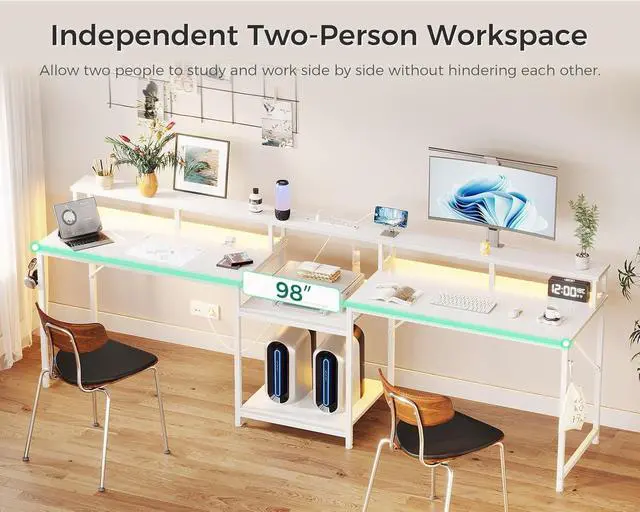 2 Person Desk DesignThe 98 inch double computer desk features an extra-long double workstation with an open storage shelf in the middle, providing a spacious and comfortable space for two people to work, study and entertain collaboratively while maintaining their individual space. This dual desk for two can suit in office, study and bedroom with its functionality and simple, practical design. Enjoy a new level of productivity and pleasant interaction with our two person desk!