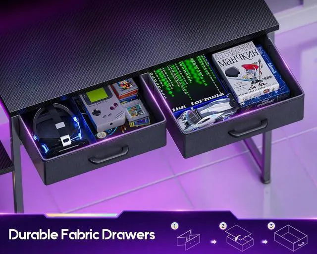 Computer Desk with DrawersThere are 2 fabric drawers that are easy to pull and push. These drawers provide ample storage space to neatly store small entertainment items such as CDs, gamepads, etc., keeping your gaming space tidy and efficient.