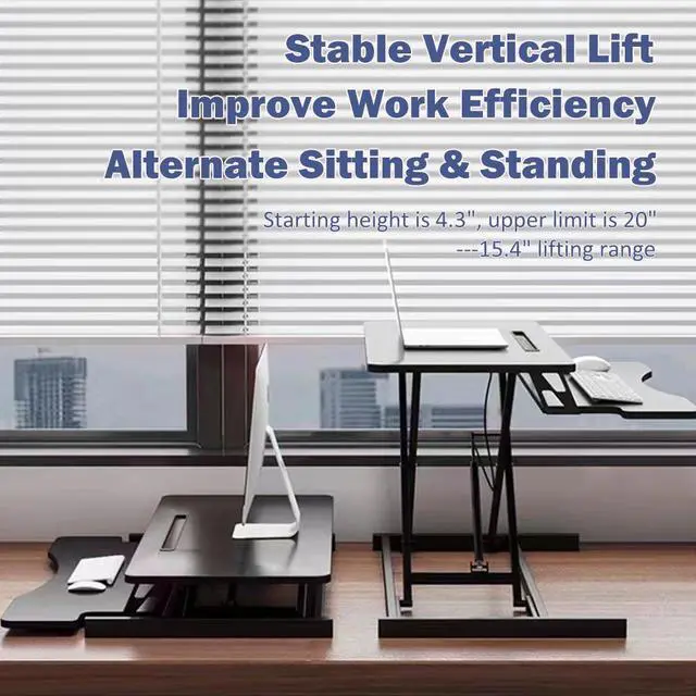 Spacious Work AreaThe top surface measures 31.5 x 15.7 providing plenty of space for single monitor, dual monitor, and laptop + computer monitor setups. Raises up to 19.8 inches and lowers down to 4.3 inches making this ideal for you no matter your height.