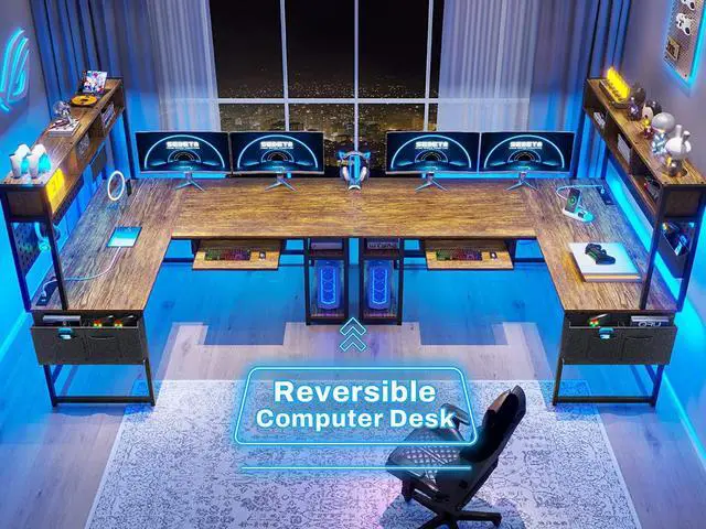 What You getL shaped desk comes with power outlet, led lights, keyboard tray, headphone hook, storage bag, top hutch and pegboard, extra long desk that can hold 3 monitors, 2 storage shelves and CPU stand. Gaming desk could hold 2 desktop computers and 1 notebook computer. An ideal desk for small rooms to create excellent home office space.