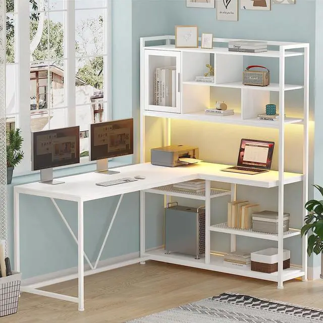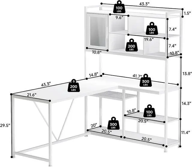 L shaped desk with 7 tiers open shelves, 1 glass storage cabinet, This 61" tall bookshelf has 7 shelves , which offer enough space to store your daily items, books, files, printer stand, CPU stand or game figure, collect trophies, and souvenirs.