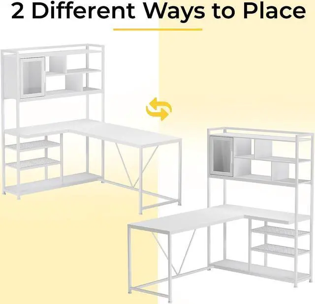 With reversible design, this home office desk can be installed in 2 directions according to your needs. The L shaped computer desk could hold two desktop computers and one notebook computer. The desktop size is 58"L*21.6"W. The simple design and multi-function storage to meet all needs. An ideal desk for small rooms or limited spaces to create excellent home office space.