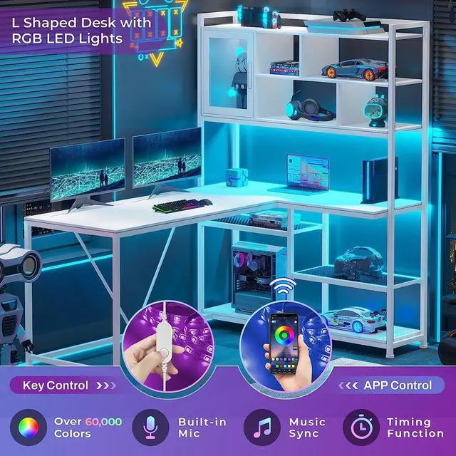 L Shape Computer Desk, 58'' Office Desk with LED Light and Bookshelf, L Shaped Corner Desk with Storage Shelves for Home Office, Gaming Desk, L Desk, Rustic Brown White
