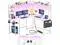 Our computer desk comes with power outlet, led lights, top hutch, Monitor Stand, storage bag, headphone hook, 4 storage shelves, CPU stand and a large L table that can hold 3 monitors.