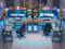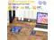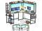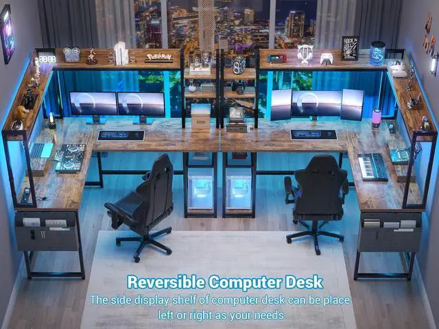 Our computer desk comes with power outlet, led lights, top hutch, Monitor Stand, storage bag, headphone hook, 4 storage shelves, CPU stand and a large L table that can hold 3 monitors.
