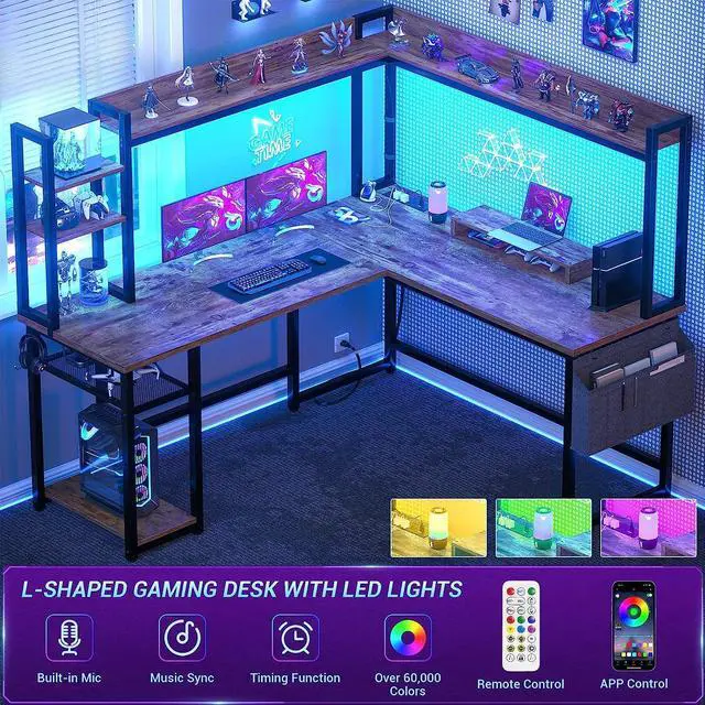 • The L gaming desk with full-size hutch, and both shelves are equipped with RGB LED light for colorful, Over 60000 colors and multiple flashing modes for your to choose. Led lights built-in music sync function can change the lights color with the rhythm of the sound and music, easily Light Up Your Gaming/working room vibe with LED Light Strip.