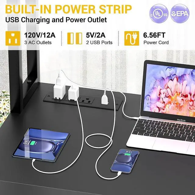 Our computer desk comes with power outlet, led lights, top hutch, Monitor Stand, storage bag, headphone hook, 4 storage shelves, CPU stand and a large L table that can hold 3 monitors.