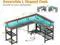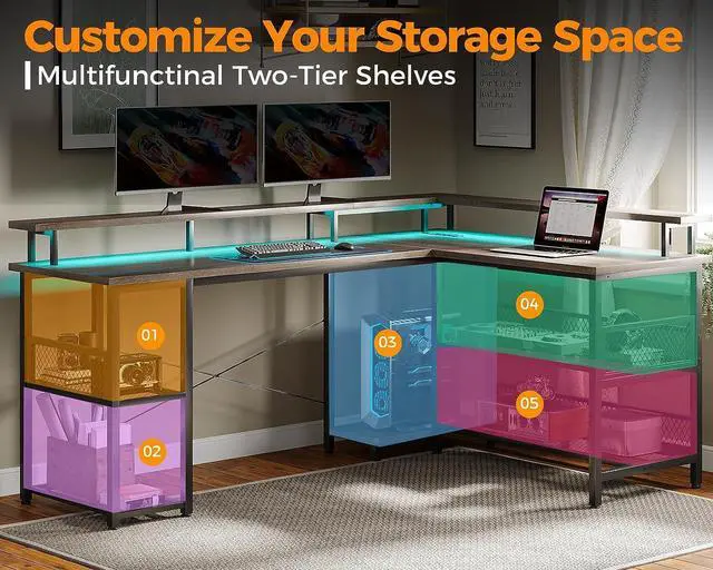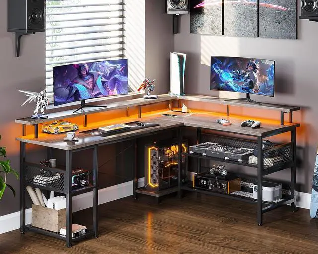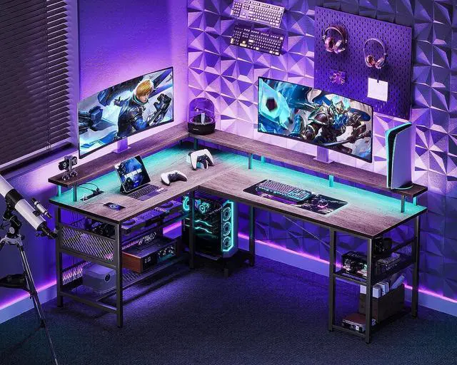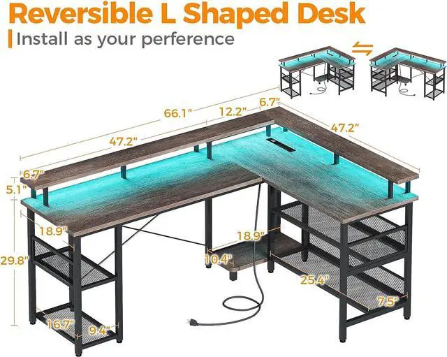 This l shaped desk with shelves features built-in LED lighting in 7 colors, 13 modes, 8 adjustable brightness levels, and 9 flicker frequencies to create an immersive gaming atmosphere. It has memory function to keep the LED lights staying on last mode when turned on.